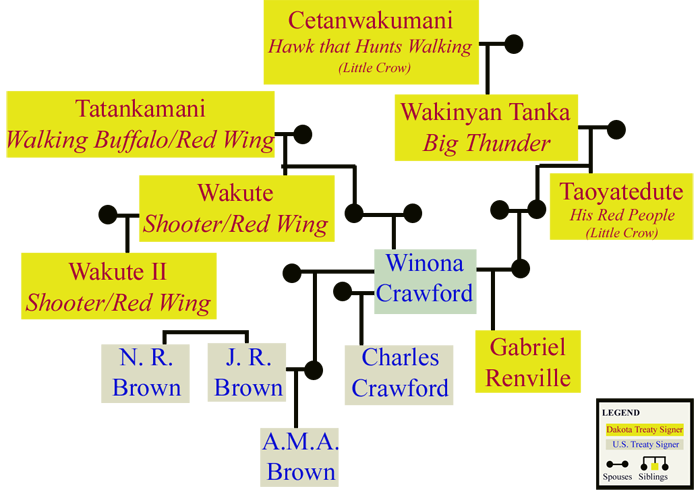 The charts presented here show some of the many family connections that affected U.S.-Indian relations. The group includes Cetanwakumani (Hawk That Hunts Walking), who signed the first Dakota-U.S. treaty in 1805. Cetanwakumani was known as Petit Corbeau, (Little Crow), a name that was passed down to his son Wakinyantanka (Big Thunder), and to his grandson Tayoyateduta (His Red People), who played a prominent role in the Dakota War of 1862. Other members of this kinship group include the men who carried the names of Wabasha and Red Wing for generations.