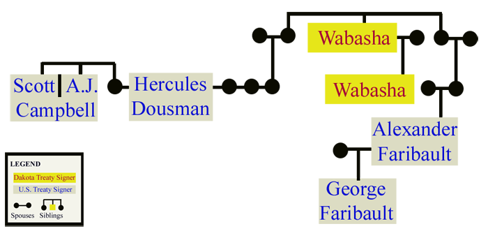 Dakota members of this kinship group were present at every Dakota treaty, including the last treaty far to the west at Fort Laramie in 1868. In addition to noted Dakota leaders, the extended family included important U.S. land speculators and fur traders such as Joseph Renshaw Brown and Hercules Dousman. The family also included mixed-blood individuals who identified themselves with a wide variety of cultural labels.