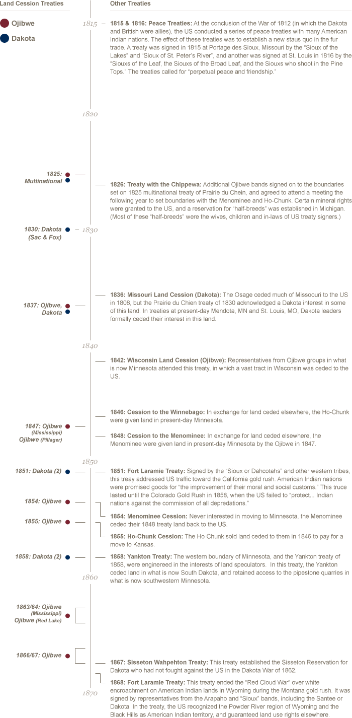 Most of the land that is now Minnesota was ceded to the U.S. by Ojibwe and Dakota people in a series of treaties over a 30-year period (1837-1867). These treaties are part of a larger picture that affected indigenous people and land in what is now Minnesota.